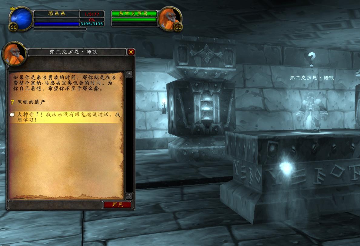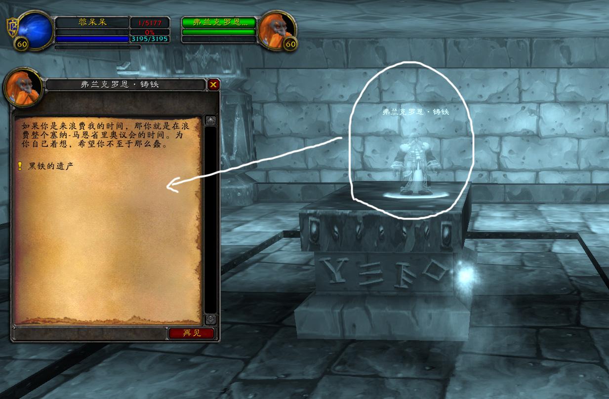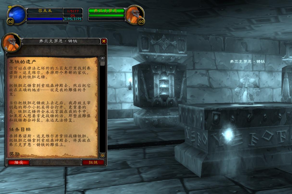 3.大师心满意足之后,又给了一个新任务,仍旧叫“黑铁的遗产”,要求杀掉弗诺斯·达克维尔并拿回战锤铁胆,放到弗兰克罗恩·铸铁的雕像上。