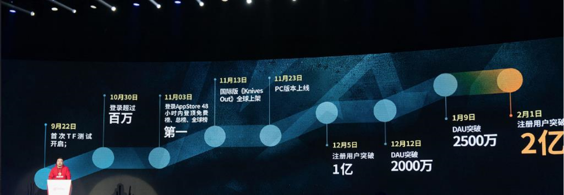 《荒野行动》自2017年诞生伊始,短短一个月的时间内登录人数就已经突破百万,随后在AppStore上48小时就登顶了免费榜、总榜与全球榜第一,伴随着国际版《Knives Out》与PC端版本的上线,《荒野行动》在不到半年的时间内注册用户达到两亿,DAU突破两千五百万大关。