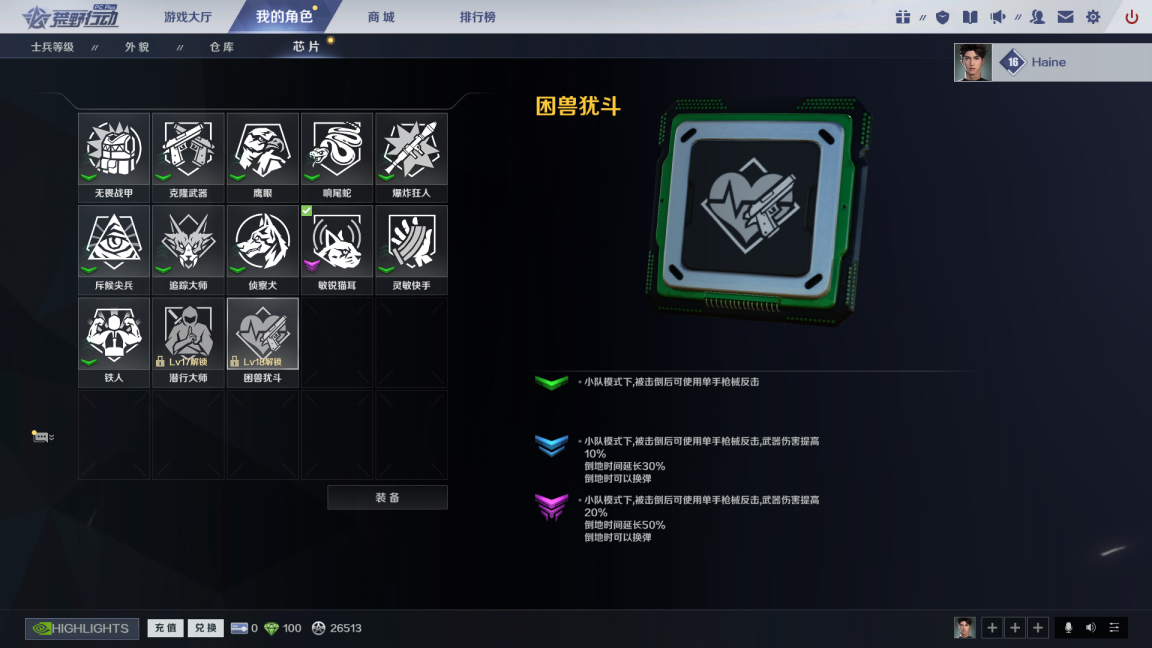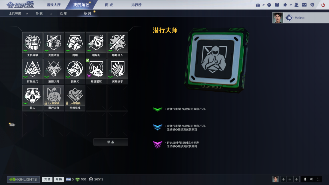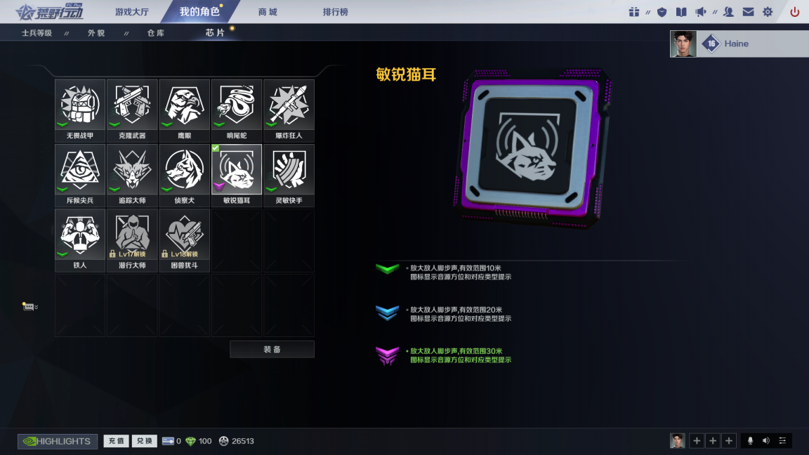 游戏现在有着十三种可选芯片,每一个芯片都会赋予你独特的游戏能力,请注意,并不是单纯的属性加成,而是会带有各种独特的能力,列如“敏锐猫耳”芯片会赋予你放大敌人脚步声、显示音源方位与声音类型的能力,让你无论是突击还是埋伏都先人一步;而“困兽犹斗”芯片则可以让你在小队模式中拥有被击倒后仍然可以还击的能力;“潜行大师”芯片不仅可以将你行走、跑步与跳跃时的声响消除,还可以让你不被心跳侦测仪给侦测到身形。