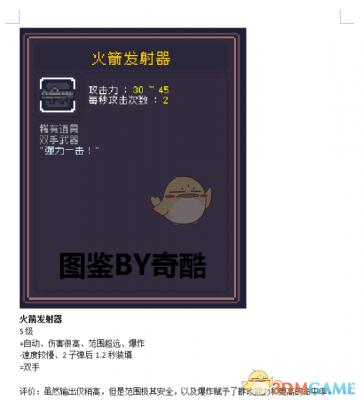火箭发射器是《Dungreed》中玩家可以使用的双手武器,自动攻击,范围超级远,伤害很高,而且会爆炸造成AOE伤害,下边就给大家带来“奇酷上传”分享的火箭发射器的数据评测,大家可以来看一看。
