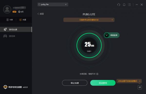 注册账号后登陆游戏,再次强调奇游的“PUBG LITE-东南亚”分区不要关,这时下载游戏奇游支持提速,速度可以提升5-20倍: