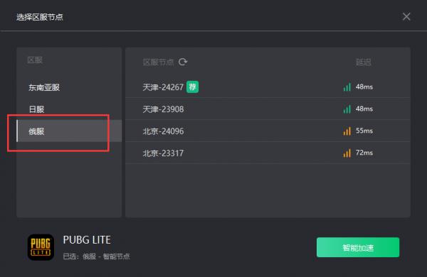 最后说明一下登陆俄服的方法:账号和东南亚服保持不变,客户端也不必单独下载,在退出游戏后,用奇游的“PUBG LITE-俄服”分区,加速后重新登录,即可进入俄服: