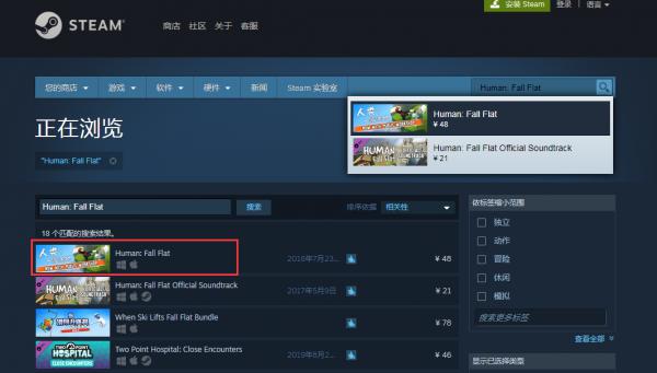 首先,打开“Steam官网”,网址,在“搜索商店”栏输入“Human: Fall Flat”找到该游戏: