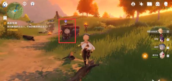 3、走到这个头上有紫色标志的丘丘人附近,即可点击和它交流,任务就完成了,完成之后你可以杀了这些丘丘人;