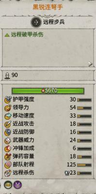T1远程步兵、轻甲单位、移速一般、远程破甲杀伤、近战渣渣、士气和冲锋一般。
