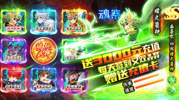 魂祭是一款日韩风格的角色扮演冒险类型的游戏,萌萌的宠物、炫酷的技能,为玩家们营造一个十分欢乐的游戏场景。角色系统,角色系统是游戏中最重要的系统,包含了角色、翅膀、勇者、时装、圣魔、头衔、神器,角色系统的养成可以为玩家提供大量的战斗力;游戏中玩家最多可以同时拥有5个角色,多种搭配多种选择。魂卡系统,魂卡系统有着众多的精美魂卡,并且玩家可以对魂卡进行强化、洗练、进阶,快来一起收集吧,还有技能,宠物,工会等大量玩法