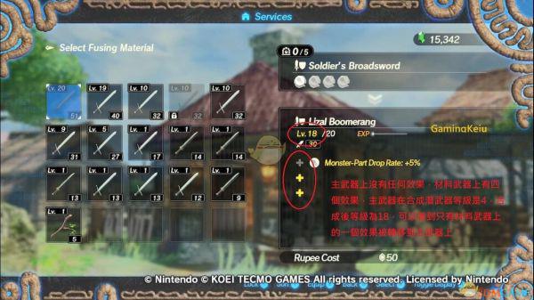 应注意的是,材料武器在合成后就会消失,我们可以武器列表中下压「L」类比键将最多5个(每个角色)武器锁定,避免不小心被误选为合成材料。选择材料武器时,可下压「R」类比键切换显示材料武器的效果列表,这样可以更方便地确认要选择的材料武器是哪个。蓝底的武器代表现正装备的武器,装备中的武器无法作为材料武器,按「X」可切换装备中的武器。