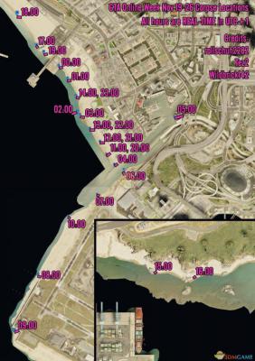 本周洛圣都西海岸会出现一具尸体和一个公文包,它们会随着现实时间每一小时换一次位置,具体见下图(东一区时间)