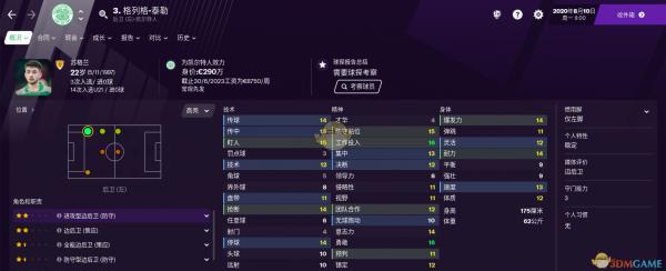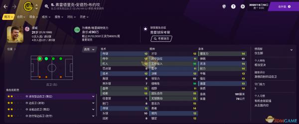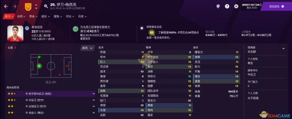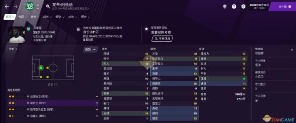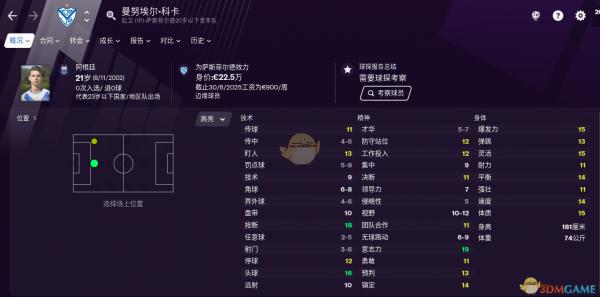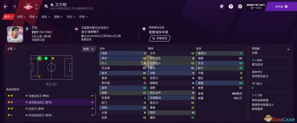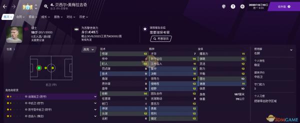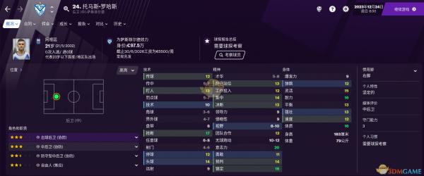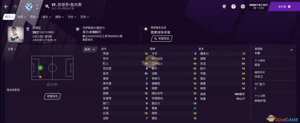各项属性都在及格线上的左边后卫,精神属性也还可以,侵略性和工作投入都在16,是一个不错的开档左后卫选择。