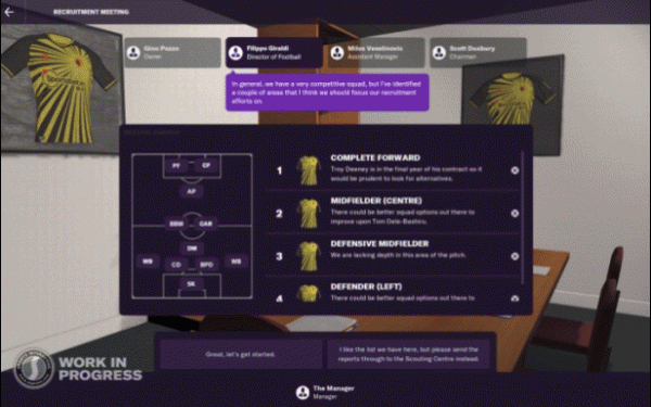 全新的职位、会议和互动让游戏中最热门的部分焕然一新。通过招募会议即能与你的球探队伍上下一心,共同安排下一步行动或俱乐部在转会市场中的长远策略。