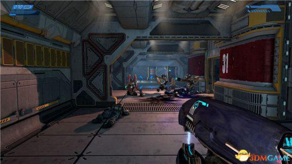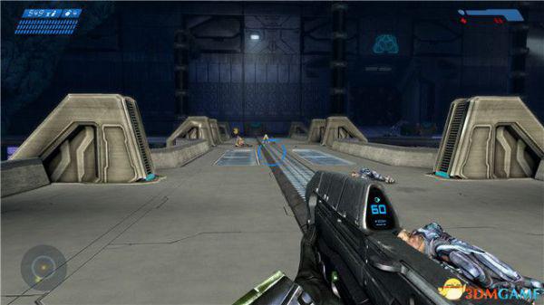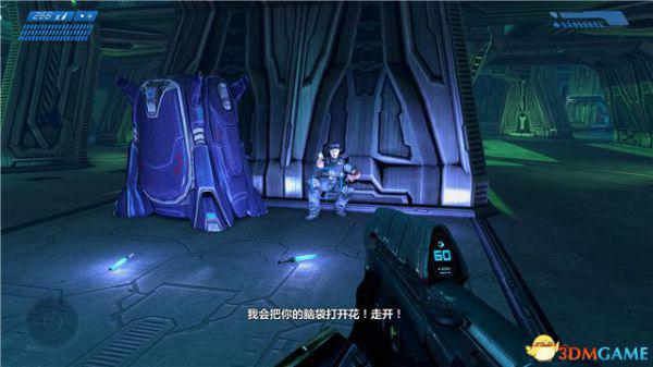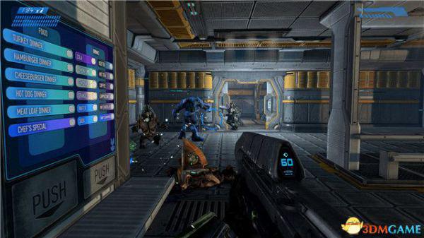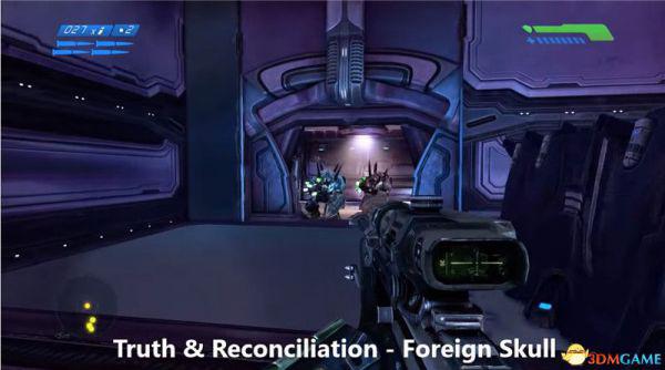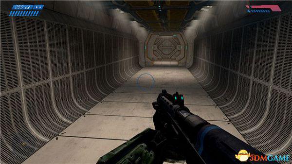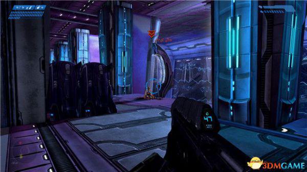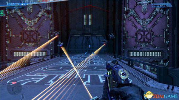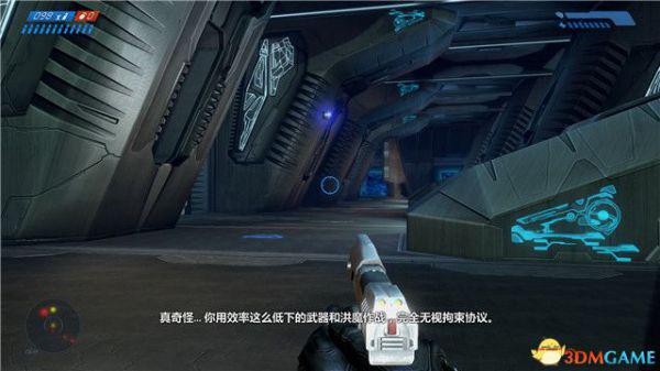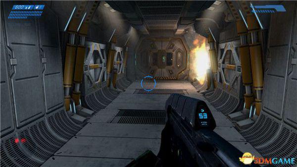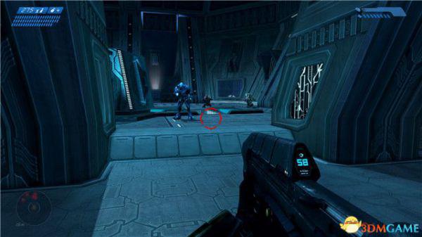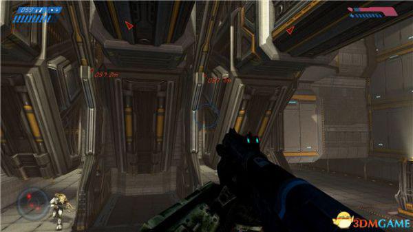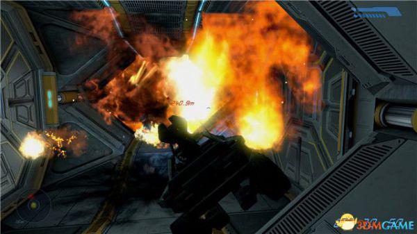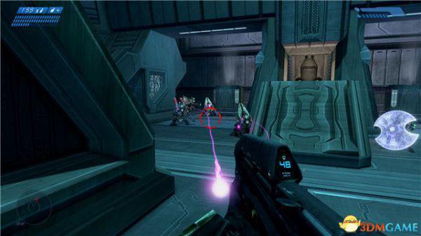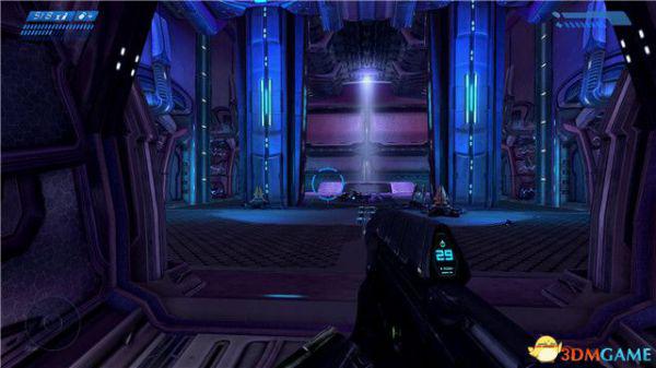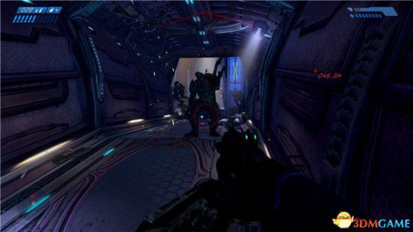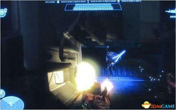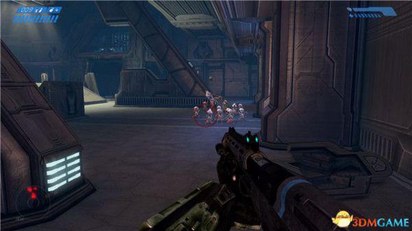 然后根据语音指挥来到个大厅,清场后在一个小屋子里有两个高级精英带一群小猪。可以把高级精英一个个引出来在拐角处喷掉或者能量剑杀掉。然后顺通道往下,中途会有两个精英拦路,从右边高台跳下去,在掩体来回躲猫猫能量剑杀掉两个继续前行。