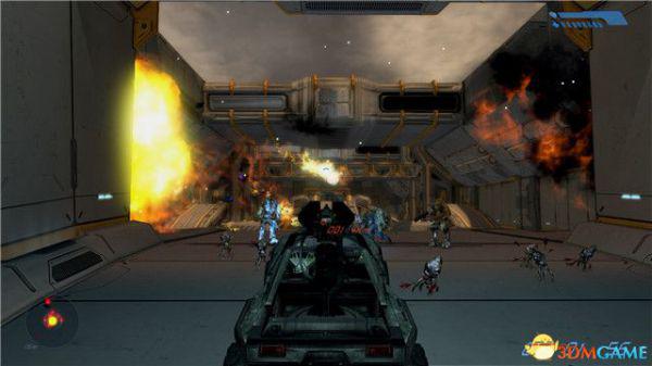 这里队友会上车,但是不会帮你忙了,所以驾驶和开炮都你自己搞定。驱车清场并虐杀猎人。进入下一环节。如果没这个可用那之前捡的火箭炮就能派上用场了。然后上电梯碰到一个拿着电浆炮的高级精英,如果还有火箭筒就好办,没有就在拐角扔粘雷上前K掉吧。