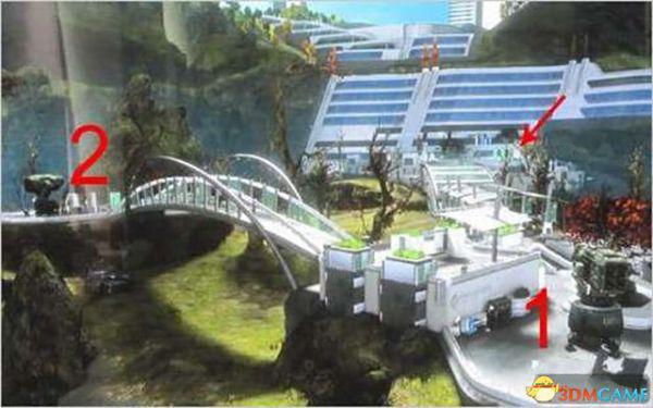剧情发生后掉到大概标记1的位置,这是一张高空俯视图,这里正面强攻的话又会很难打,因为武器初级,外加有恶心的拿光束枪的豺狼,简便方法就是换上喷气背包从后面绕箭头指的最左边的小路上去,无敌的AI队友就直接快速从正面杀出一条血路上来跟你汇合了。