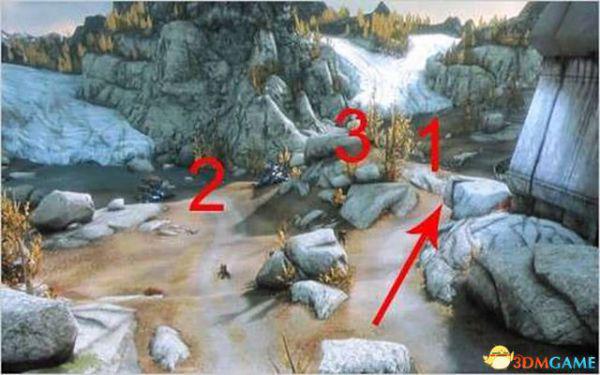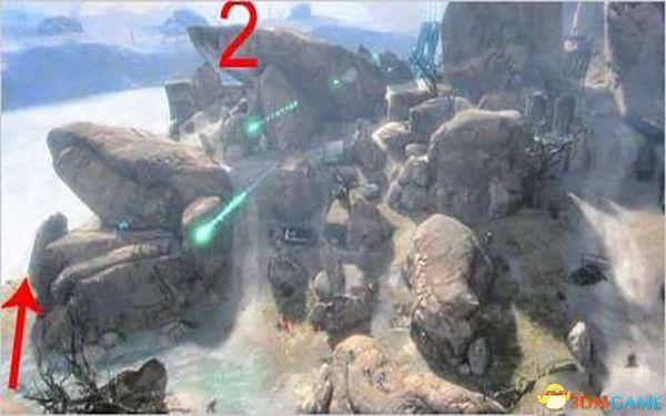 出门我们就不理会队友和小怪,直奔标记1的地方,使用目标定位器,如果你要解“一箭双雕”的成就的话,就需要定位在标记2的地方。传奇难度得炸两轮才能炸爆。定位好了就无敌,看两辆亡魂号的炮都落地了立马起身跑。如果第一次爆了一辆就去自杀了从来吧。标记3的山顶上有火箭筒可拿。