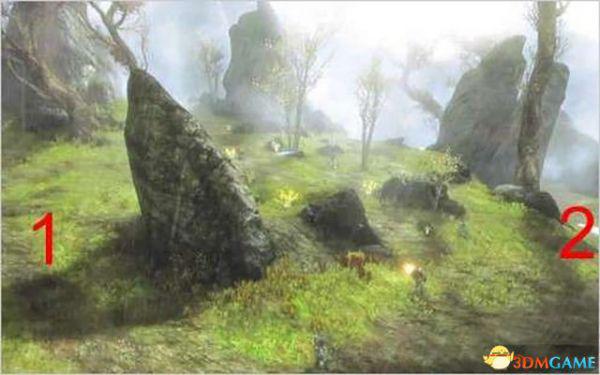 然后往前走就会碰到再一群小猪和豺狼,正常情况大家就顺着标记1的道路清过去,如果你不想打的话就走右边标记2的路跑过去,几个无敌NPC队友就会快速碾压到下一场景。