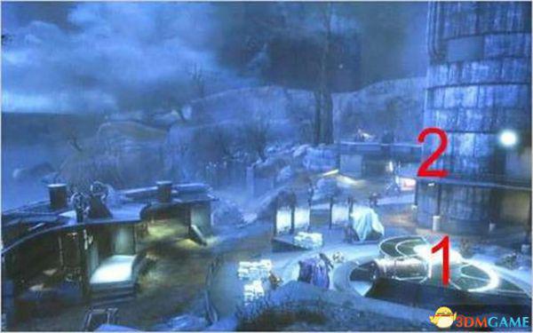 先清掉右边小屋里的敌兵,然后在标记1处有狙击枪可拿。狙掉标记2和箭头处的豺狼兵,我们可以不理会下面那辆幽魂号,直接从箭头方向到标记2处开启开关。然后回到基地。