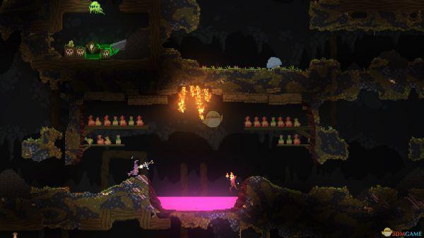 特殊分组类,触发或者定时弹或者双重触发弹,关于触发弹效果就跟法杖施法一样,只不过法术施放由触发弹完成,比如触发火花加十字架,就是在火花弹命中时在击中位置放十字架,双重触发就是同时释放两个法术跟法杖施法一个效果。搞清楚分组的概念后,说一下防御被动类,比如火把,护盾等,这些会在格子位置做一个节点,效果初始化,比如,4重,火把,4个魔法箭,实际分组效果被火把中断了。所以被动类一定要放最前或者最后。