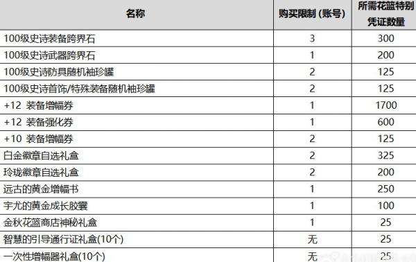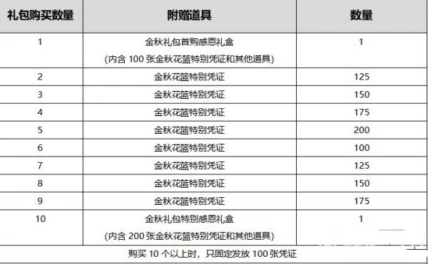 2、购买1个2020金秋礼包即可获得100个金秋花篮特别凭证。
