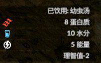 饮用幼虫汤:8蛋白质、10水分、5能量、理智值-2。
