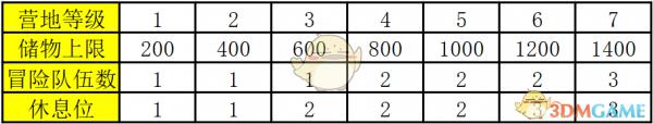 营地是城镇主建筑,其他建筑等级不能超过营地。(目前一图上限5级、二图上限7级)营地主要用途是提高仓库上限,同时可以通过消耗不同等级的时间石来提高游戏全局速度,也就是加速功能