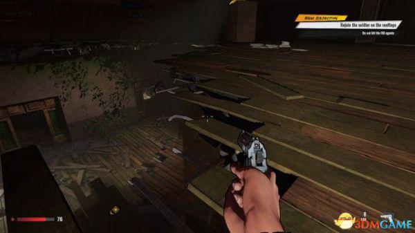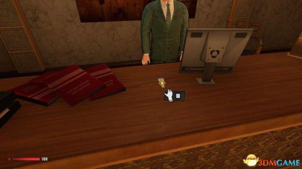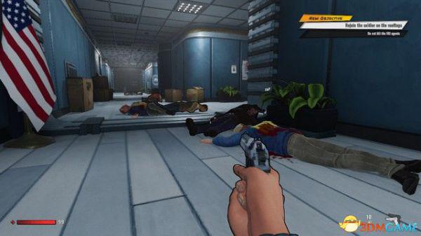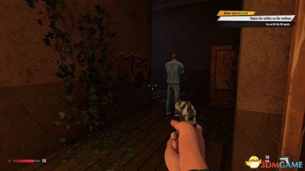 进入房间后,拿起椅子,开门,使用使用砸晕门外的FBI,捡起他的武器。