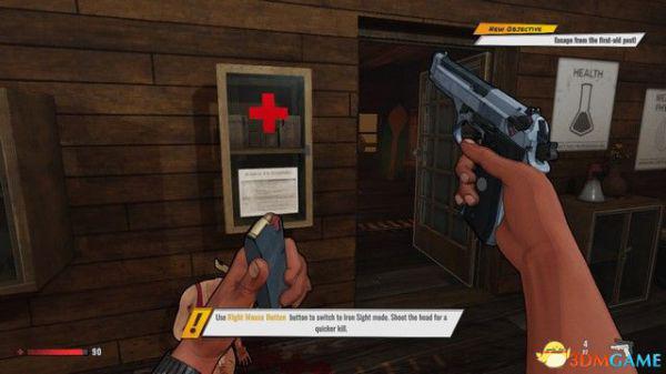 桌子上有一把手枪,将其拿起,可以机瞄,按住右键就是瞄准。