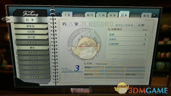 “一共有30种鱼,目前钓到4种,钓具等级3级。图3。”