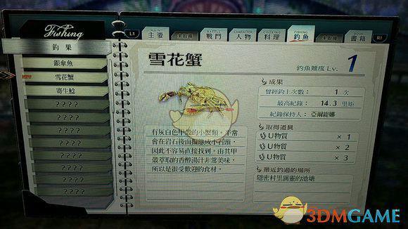 ps:记得钓6只雪花蟹,存满18个U物质,之后到某个地点可以换月镜回路(看宝箱专用。)
