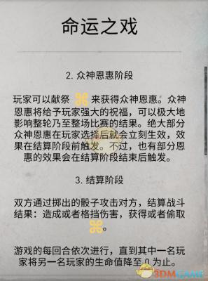 在命运之戏中,两位玩家需要掷骰子,激活众神恩惠,进行对决。率先将对手生命值降至0的玩家获胜。每一轮包括三个阶段: