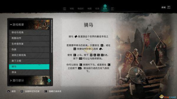 召唤马匹键盘按住X,手柄按住左十字键。上马键盘按“E”,手柄按“Y”,马匹冲刺键盘按“shift”,手柄按“左摇杆”。下马键盘“C”,手柄“B”。还有一种下马方式是朝当前行进的方向飞身跃下,操作方法是按住C(手柄B)之后按下空格(手柄按住A)。