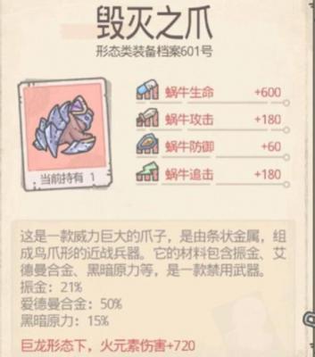 最强蜗牛毁灭之爪怎么获得?毁灭之爪配合巨龙形态可以增加720的火元素伤害,可谓是非常厉害的,下面磊哥游戏为大家介绍下最强蜗牛毁灭之爪获得攻略。