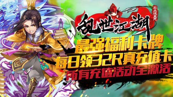 《乱世江湖(卖血送真充)》巅峰武侠卡牌巨制,新版本独家增加真充值卡系统,每日送32RMB真充值,所有充值活动全激活,更有升级送充值,推图送充值,只为让玩家玩的尽兴!2020首选武侠策略卡牌手游,国手级原画师打造高精度武侠题材策略卡牌游戏;致敬热血经典武侠世界,一级高端影视特效,暴爽画面冲击感,畅享扣人心弦的极致对战体验,勾起你不羁的剑侠情怀。
