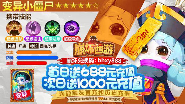 【崩坏西游】上线就送满技能格(15格)的神兽,500本高级技能书,8888元宝,首日100级送688元充值,次日凌晨追送1000元充值,触发首冲和历史充值,登峰造极的福利只为您的到来,快人物行走速度,加快战斗动作,沉浸式战斗,全新西行之路活动,简约而不简单,玩法一环接一环,世界的美好和你环环相扣