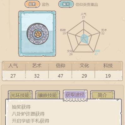 1、在游戏中,天宫图可以通过抽奖获得,八卦炉许愿获得,开启学徒手札获得;