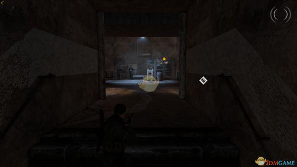 6、 这时候我们来到了三楼,先不要急着冲出去,匍匐来到门口用消声手枪干掉门口的卫兵后,向左走你会现在有一个德军军官和两个卫兵正在看着墙上的地图,先用手枪干掉一个敌人后,马上换成机枪搞定另外两个;