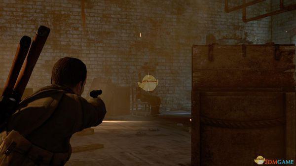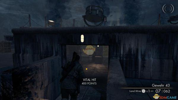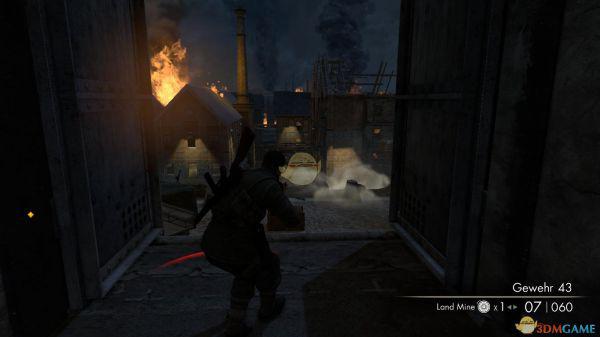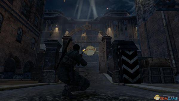 3、 很轻松的干掉巷子里的敌人后,接着来到巷子最深处,在左边你会发现一个五层的堡垒式建筑,这里面就是我们的预定狙击点,想要进去当然必须得干掉守门的卫兵,笔者的打法是先趴在铁门处,因为光线不足的缘故,敌人不会很快发现你,首先开枪干掉右边离机枪点最近的德兵,然后逐个干掉其他的敌人。