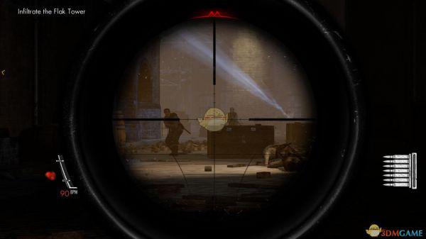 8、 悄悄的干掉两边的敌人后,来到指挥所放颗手雷进去就可以轻松解决,接下来就来到了我们预定的狙击点,进入剧情后看见了我们对面高塔上需要暗杀的军官,这时候屏住呼吸,瞄准他的脑袋,开枪吧,少年。