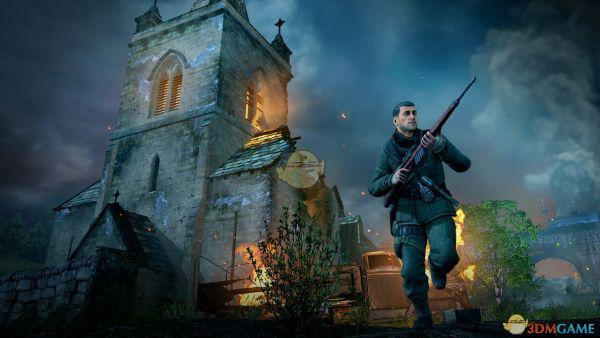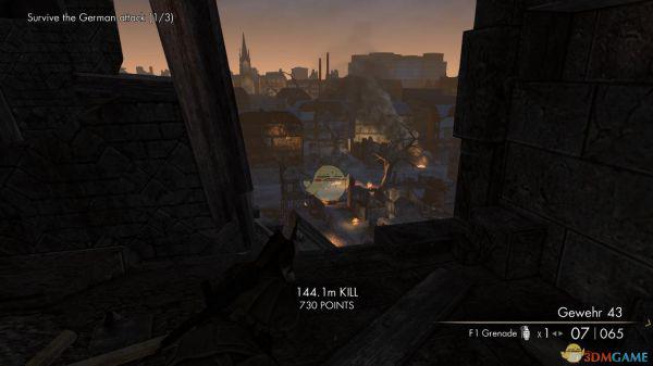 3、接着跟着提示来到了一个教堂,解决了里面几个杂兵后,来到教堂的最高处可以得到第三把狙击枪G43,经过剧情后开始进入本章最激情的守住三波攻击,第一波攻击要注意的是要先干掉你正对面二楼的狙击手,第二波则会出现一辆装甲车,它的”小红帽“有4个都在车身正前方皆可爆之,第三波又有一辆坦克,打法和第二波类似;