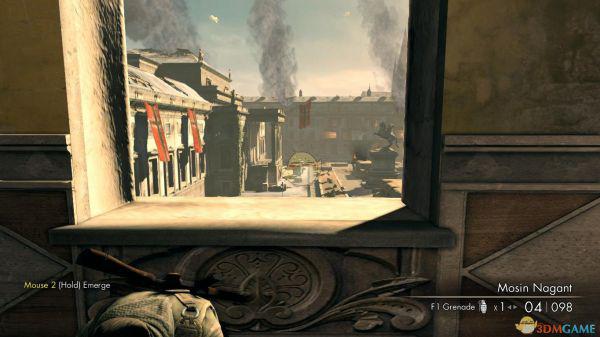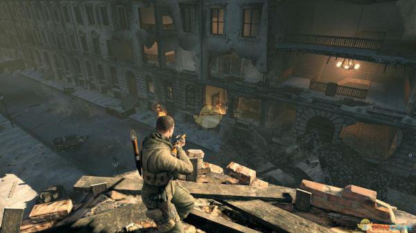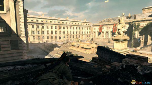 1、一开始主角出生在了一条道路上,解决两个闲逛的德兵后,来到了一片开阔地,前后左右各有一栋办公大楼式的建筑物,右边的大楼就是预定的狙击点,周围都有重兵把守,笔者建议这里的打法是先上离你最近的一栋大楼内,解决掉里面的士兵后,来到三楼,从窗口正好可以将整个战场一览无余,那么就开打吧,少年。