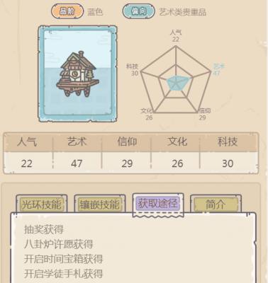 1、在游戏中,黑森林布谷鸟钟可以通过抽奖获得、八卦炉许愿获得、开启时间宝箱获得、开启学徒手札获得;