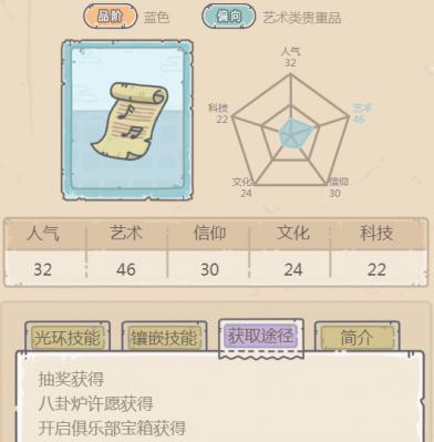 1、在游戏中,巴赫协奏曲可以通过抽奖获得、八卦炉许愿获得、开启俱乐部宝箱获得;