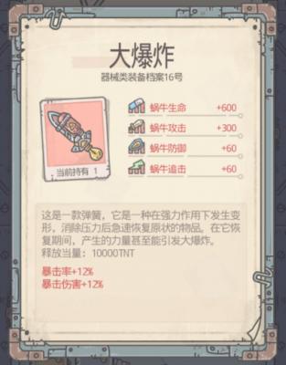 3、大爆炸可以加600血量、300攻击力、60防御跟追击,更能提供12%的暴击率跟暴击伤害。