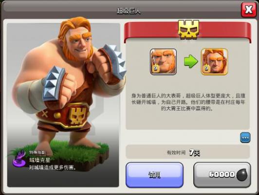 2、玩家点击商人帐篷旁新出现的超级部队建筑,然后选择想要强化的部队即可强化巨人。