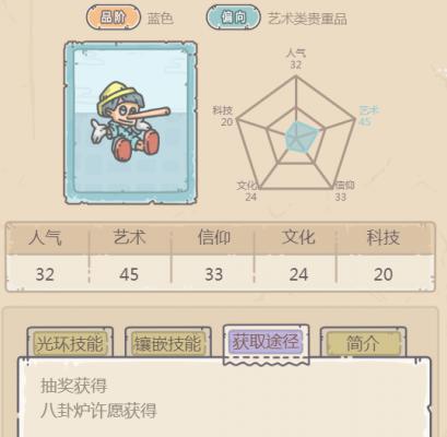 1、在游戏中,匹诺曹木偶可以通过抽奖获得、八卦炉许愿获得;