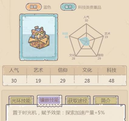 3、镶嵌技能:置于时光机,赋予效果:探索加速产量+5%。
