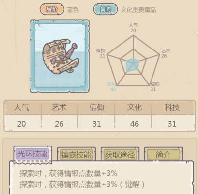 2、光环技能:探索时,获得情报点数量+3%,探索时,获得情报点数量+3%(觉醒);