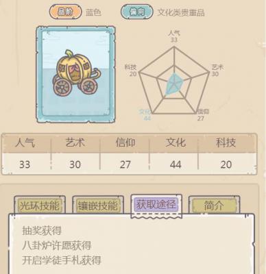 1、在游戏中,灰姑娘的南瓜车可以通过抽奖获得、八卦炉许愿获得、开启学徒手札获得;