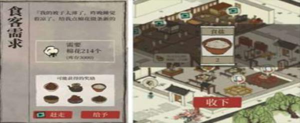1、首先玩家需要来来到客栈,客栈里面会有一些食客,可以根据食客的需求提示进行兑换,比如棉花和布这些资源;