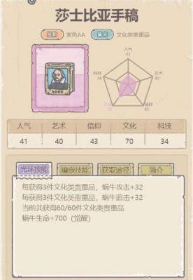 2、光环技能:每获得3件文化类贵重品,蜗牛攻击+32 每获得3件文化类贵重品,蜗牛追击+32 当前共获得60/60件文化类贵重品 蜗牛生命+700(觉醒);