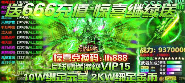 【烈火战歌(送648元充值)】送648元充值,就是那么的朴实无华。上线赠送满级VIP15,10W绑定元宝,2KW绑定金币,VIP礼包全是1绑定元宝购买,1绑定元宝,1绑定元宝。